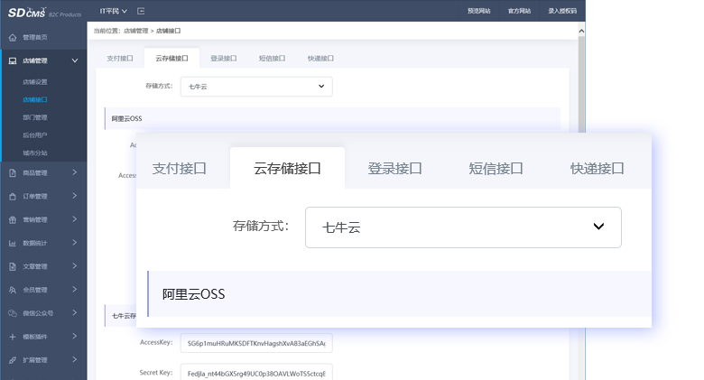 系統(tǒng)支持:阿里云短信接口、騰訊云短信接口,阿里云OSS接口、七牛云存儲接口,快遞鳥快遞接口。