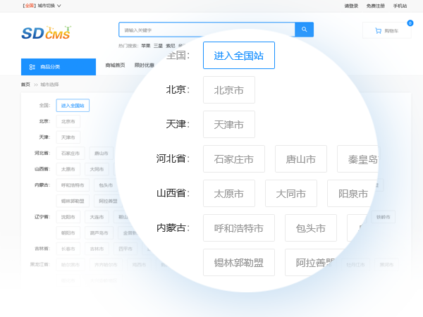 一鍵開啟或關(guān)閉四百多個省市的城市分站,支持目錄形式和二級域名綁定。