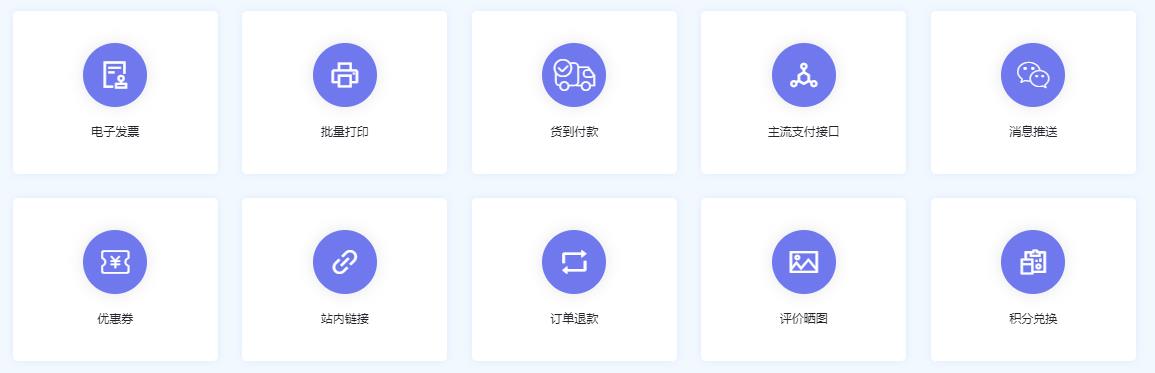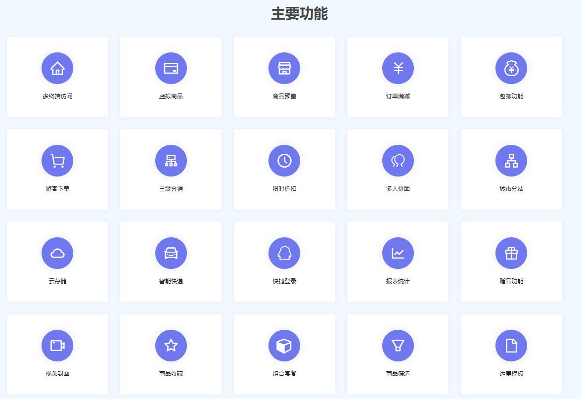 主要功能多終端訪問虛擬商品商品預(yù)售訂單滿減包郵功能游客下單三級分銷限時折扣多人拼團城市分站云存儲智能快遞快捷登錄報表統(tǒng)計贈品功能視頻封面商品收藏組合套餐商品篩選運費模板電子發(fā)票批量打印貨到付款主流支付接口消息推送優(yōu)惠券站內(nèi)鏈接訂單退款評價曬圖積分兌換一套模板多款色系豐富的色彩搭配、后臺一鍵切換多種營銷功能贈品、組合銷售、優(yōu)惠券、限